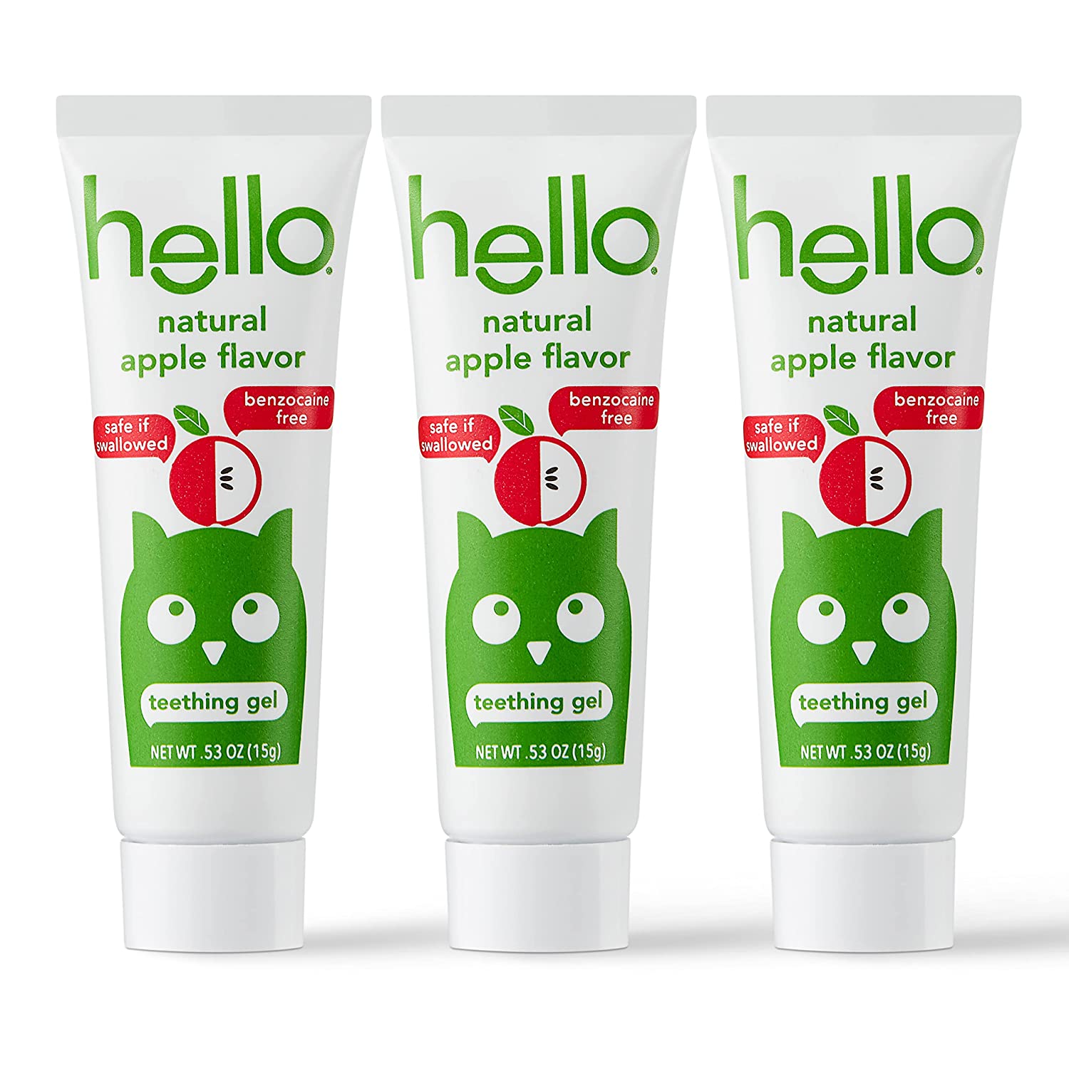 The good teething gel for your baby. Hello, Natural Apple Flavor Baby Teething Relief Gel is a natural, vegan, safe-if-swallowed product containing three 0.53-ounce tubes of delicious natural apple-flavored teething gel free from dyes, SLS, and sulfates.